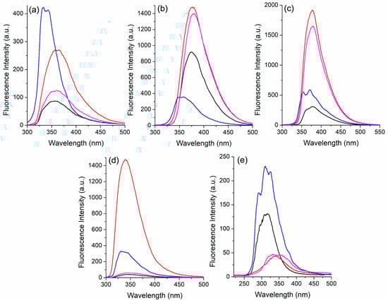 Steady-state fluorescence emission spectra of the pyridine-based fluorophores (a) 3a, (b) 3d, (c) 3e, (d) 3f, and (e) 3j in solution [~10−5 M] in benzene (black), ethanol (red), hexane (blue), and dichloromethane (magenta).