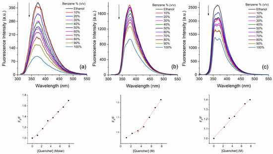 Steady-state fluorescence emission titration of fluorophores (a) 3c, (b) 3e, and (c) 3i in ethanol upon different amounts of benzene (v/v). Below are presented the respective plots of F0/F vs. [quencher], according to Stern–Volmer Equation.