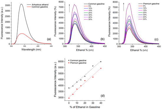On the other hand, fuel adulteration, particularly of commercial gasoline, is one of the major illegal practices nowadays involving the addition of organic solvents or alcohol in different amounts than those recommended by the legislation [22]. Again, in this specific issue, it is desirable to develop sensors for fuel-quality monitoring. As already observed in this investigation, the good solubility of the fluorophores in hexane, as well as their tailored intensity in this solvent and ethanol, allowed us to explore their ability to sense gasoline. This application is particularly interesting in our country since Brazilian gasoline presents 27% of anhydrous ethanol for standard and 25% for premium types of gasoline [76]. In this way, fluorophore 3f was chosen as a model, and its photophysical behavior was first investigated in real samples of commercial gasoline and anhydrous ethanol, as shown in Figure 6a. It can be observed that 3f presented a similar behavior if compared to hexane/ethanol, with increased emission in anhydrous ethanol (4-fold) if compared to commercial common gasoline (Figure 6a).