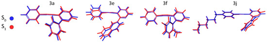 Superposition of S0 (blue) and S1 (red) optimized geometries for 3a, 3e, 3f, and 3j. The results depicted are using implicit benzene solvation.