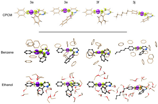 Electronic density difference (EDD) for 3a, 3e, 3f, and 3j. Above, under implicit CPCM (benzene) solvation. Below, the target molecules are represented in dark gray with explicit solvent molecules. Purple density identifies electronic density lost and yellow electronic density gained.
