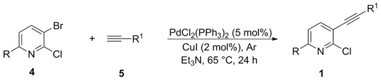 Synthesis of 2-chloro-3-(organylethynyl)pyridines 1a–e.