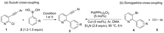 The synthesis of 2-aryl-3-(organylethynyl)pyridines 3 is little explored in the literature. We found two protocols starting from halopyridines (Scheme 3). The first, described by Shibata and coworkers [66], adopts two distinct Suzuki-type cross-coupling reactions using 3-organylethynyl-2-chloropyridines 1 (obtained by Sonogashira-type cross-coupling reactions) and aryl boronic acids 2 (1.2–1.5 equiv) (Scheme 3a). The second, described by Shestakov and coworkers [67], presents an inverse reaction proposal, initially obtaining 4 by a Suzuki-type cross-coupling reaction. Then, these 2-aryl-3-bromopyridines 4 were used together with organylacetylenes 5 in a Sonogashira-type cross-coupling reaction to give 3 (Scheme 3b).