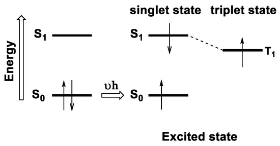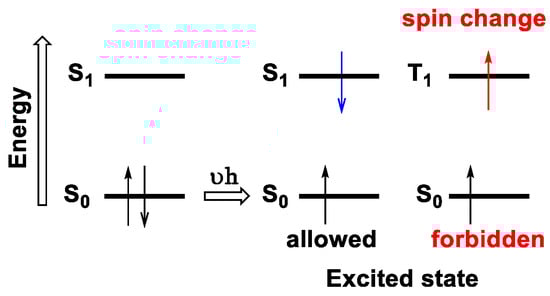All transition necessitates the absorption of a photon in a first step, and the resulting excited compound (very reactive species) can afterward experience a photochemical reaction, leading to a new product, or can go back to the ground state via fluorescence or phosphorescence emission. However, there are some restrictions during these processes because some of these transitions are allowed while others are not, according to the selection rules: any transition that implies that the reaction entropy is not zero (ΔS ≠ 0) is strongly forbidden. A typical example is the absorption of a photon from a chromophore, which indeed leads almost always to the formation of the singlet excited state (allowed transition) and not the triplet excited state (forbidden transition). This is because, in the first case, the transition occurs between states of the same multiplicity (S0 + νh→S1), whereas in the latter, it occurs with a different multiplicity (S0 + νh→T1), which otherwise would involve change in the spin state (Figure 13).