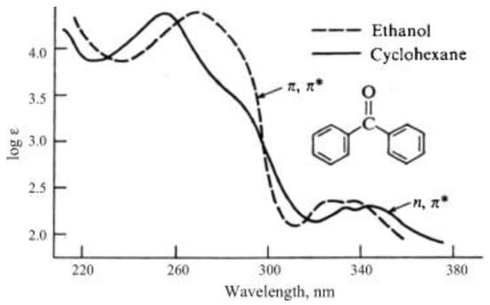 Absorption spectrum of benzophenone in ethanol (dotted line) and in cyclohexane (solid line). Reprinted adapted with permission from Ref. [4]. Copyright 2008, Elsevier.