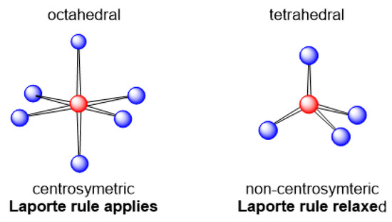 Charge transfer (CT) and d-d transitions are usually found in inorganic compounds since they typically contain metal ions, which, in combination with ligands, sometimes allow such transition to occur [9]. The d-d transition usually is observed from transition metal ions’ complexes when one electron from a lower d orbital energy state is promoted and jumps to another d orbital of higher energy state; however, this transition is forbidden by the Laporte rule [10]. This rule is mainly applied for those compounds that possess centrosymmetric point symmetry. It states that all transitions that conserve parity during the electronic transition either going from p-p or d-d are forbidden, but s-p and p-d are allowed. However, if the centrosymmetry is disturbed, the Laporte rule can be overcome, and the transition can take place (Figure 12).
