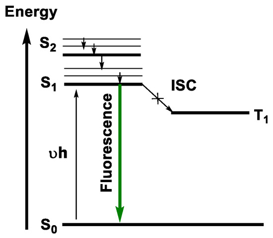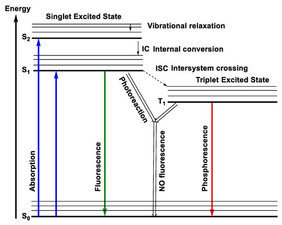 The absorption of the photon can provoke a change in the electronic distribution of matter, thus changing the reactivity and therefore leading to either a photochemical reaction, fluorescence, or phosphorescence emission. According to Kasha’s rule, fluorescence always occurs from the lowest singlet excited state (S1). However, excitation usually takes place to higher energy levels than S1 (e.g., S2, S3 … Sn). In addition, each excited state usually is associated with the access of vibrational energy (v) (e.g., v = 0, 1, 2 … n), which relaxes quickly (time scale 10−13 to 10−9 s in the condensed phase) to v = 0 as heat. It can also undergo fast internal conversion (IC) S2–S1, within 10−9 to 10−7 s. From this point, it can go back to the ground state in four possible ways: (a) via a chemical reaction giving new products, (b) by emission of the absorbed photon (fluorescence), (c) by intersystem crossing (ISC) through the change of spin to reach the triplet excited state (T1), and (d) by internal conversion (IC) by heat emission, which further can lead to photochemical reaction or phosphorescence (Figure 14) [11]. Fluorescence and phosphorescence phenomena will be explained below in more detail.