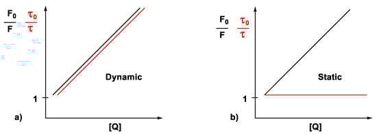 with M being the ground state fluorophore, M* the excited fluorophore, Q the quencher, and Q* the excited quencher. Intermolecular quenching in the dynamic mode diminishes both the emission intensity and the lifetime of the fluorescent species. Therefore, the terms and against the concentration of the quencher follow the same trend (Figure 16a). However, with static quenching, because of the quencher and the fluorophore complex in the ground state, the number of potential fluorescent species decreases, thus only decreasing the emission intensity without changing the lifetime of the emission; hence the term is independent of the concentration of the quencher.