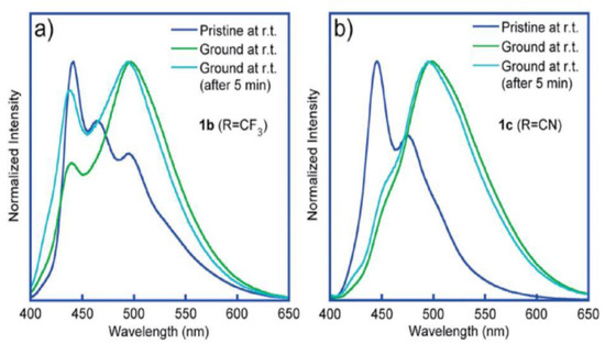 - Xue, S.; Qiu, X.; Sun, Q.; Yang, W. Alkyl length effects on solid-state fluorescence and mechanochromic behavior of small organic luminophores. J. Mater. Chem. C 2016, 4, 1568–1578. [Google Scholar] [CrossRef]