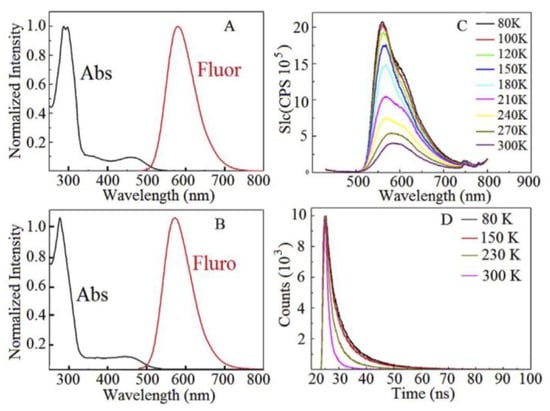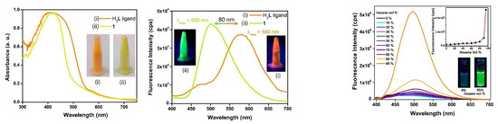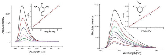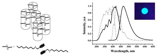 One of the most appealing examples of fluorescence is when the absorption process occurs in the UV, invisible region for the human eye, and emits in the visible region. Since its discovery, fluorescence, due to its intrinsic properties and easy detection, has been used to detect optical properties and found widespread applications in light-emitting diodes (LEDs) [13,14,15], chemical sensors [16,17,18] for toxic compounds [19,20,21,22], nitro derivatives, herbicides [23,24,25,26,27,28,29], and medicine [30,31,32,33,34].