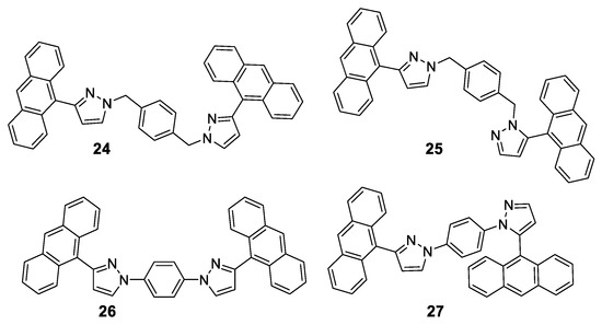 - Zhang, Z.; Zhang, Y.; Yao, D.; Bi, H.; Javed, I.; Fan, Y.; Zhang, H.; Wang, Y. Anthracene-Arrangement-Dependent Emissions of Crystals of 9-Anthrylpyrazole Derivatives. Cryst. Growth Des. 2009, 9, 5069–5076. [Google Scholar] [CrossRef]