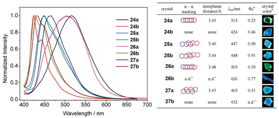 - Kohmoto, S.; Tsuyuki, R.; Masu, H.; Azumaya, I.; Kishikawa, K. Polymorphism-dependent fluorescence of 9,10-bis(pentafluorobenzoyloxy)anthracene. Tetrahedron Lett. 2008, 49, 39–43. [Google Scholar] [CrossRef]
