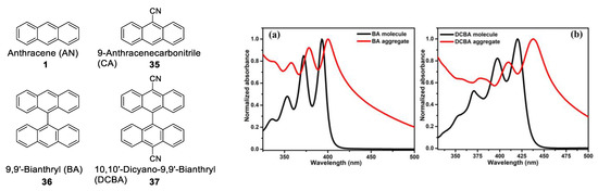 - Gao, Y.; Liu, H.; Zhang, S.; Gu, Q.; Shen, Y.; Ge, Y.; Yang, B. Excimer formation and evolution of excited state properties in discrete dimeric stacking of an anthracene derivative: A computational investigation. Phys. Chem. Chem. Phys. 2018, 20, 12129–12137. [Google Scholar] [CrossRef] [PubMed]