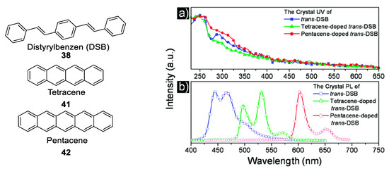 - Wang, H.; Li, F.; Gao, B.; Xie, Z.; Liu, S.; Wang, C.; Hu, D.; Shen, F.; Xu, Y.; Shang, H.; et al. Doped Organic Crystals with High Efficiency, Color-Tunable Emission toward Laser Application. Cryst. Growth Des. 2009, 9, 4945–4950. [Google Scholar] [CrossRef]