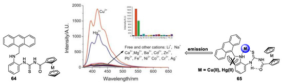 - Ge, J.-Z.; Zou, Y.; Yan, Y.-H.; Lin, S.; Zhao, X.-F.; Cao, Q.-Y. A new ferrocene–anthracene dyad for dual-signaling sensing of Cu(II) and Hg(II). J. Photochem. Photobiol. A Chem. 2016, 315, 67–75. [Google Scholar] [CrossRef]