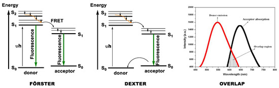 Dynamic quenching occurs when an excited molecule (donor) collides or is in proximity to an acceptor molecule, and hence, electron transfer becomes possible. It was Förster [38] in 1951 who proposed the electron transfer mechanism as one of the possible ways of quenching (Scheme 1, left). According to him, due to charge oscillations, the donor and acceptor can be affected if they are in close proximity (~10 nm) in order to transfer one electron from the single excited state of the donor to an excited state, which has to be lower in energy, of the acceptor (Scheme 1). However, for this process to occur, there should be an overlap between the emission of the donor and the absorption of the acceptor molecule.