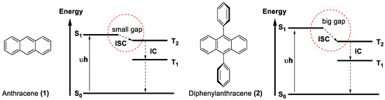 Anthracene is one of the simplest polycyclic aromatic hydrocarbon compounds derived from coal tar (1.5% anthracenes) as the main source. Anthracene belongs to the family of polycyclic aromatic hydrocarbons (PAHs), a class of organic compounds containing multiple aromatic rings [49]. It is composed of three fused benzene rings and is an example of an organic compound acting as a metal-free triplet photosensitizer. A photosensitizer, on the other hand, is a chemical entity capable of harvesting light (energy) and transferring it to its surroundings (molecules), which otherwise could not absorb at this wavelength. This class of organic compounds is particularly attractive for dye-sensitized solar cells [50,51], semiconductors, OLED [52], or lasers [53]. The heavy-metal-free triplet photosensitizer properties of anthracene lie in the fact that the energy levels of the singlet excited state (S1) and of the triplet excited state (T2) are in close proximity (Scheme 2, left), allowing for efficient (up to 70%) intersystem crossing (ISC) [54,55]. However, substitution of anthracene 1 in positions 9 and 10 with phenyl groups as in 2 (diphenylanthracene) [56] prevents π-π stacking and inhibits intersystem crossing simply due to noncoplanar phenyl groups to the anthracene moiety, which ultimately leads to a difference in the singlet and tripled excited states, resulting in a preferred fluorescence rather than phosphorescence emission (Scheme 2, right) [57]. In addition to the favorable energy (small) difference between (S1) and (T1) on anthracene moiety, the close proximity effect during the π-π stacking is another factor that favors ISC, suppressing one of the two preventing it.