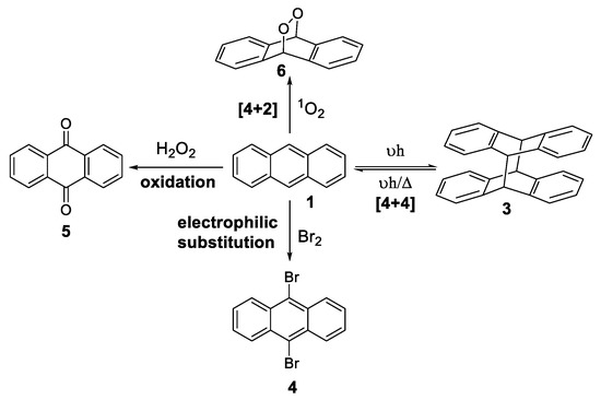 Due to its rigid, planar, electron-rich, and fully conjugated structure, the anthracene compound is known to react via: (i) Diels–Alder [4 + 4] and [4 + 2] cycloadditions, forming the dimer 3 and the peroxide 6 [58], in the presence of another anthracene molecule or singlet oxygen, respectively; (ii) electrophilic substitution to obtain 4 [59], and (iii) oxidation [60] to the anthraquinone 5 (Scheme 3).