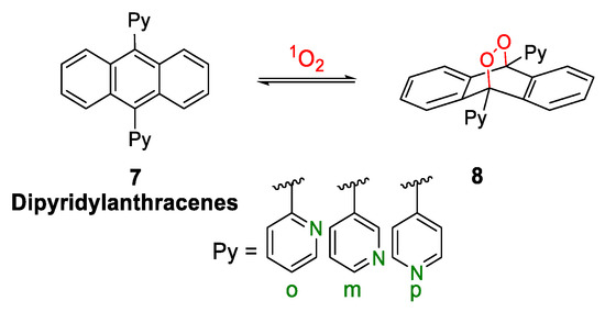 - Fudickar, W.; Linker, T. Synthesis of Pyridylanthracenes and Their Reversible Reaction with Singlet Oxygen to Endoperoxides. J. Org. Chem. 2017, 82, 9258–9262. [Google Scholar] [CrossRef]