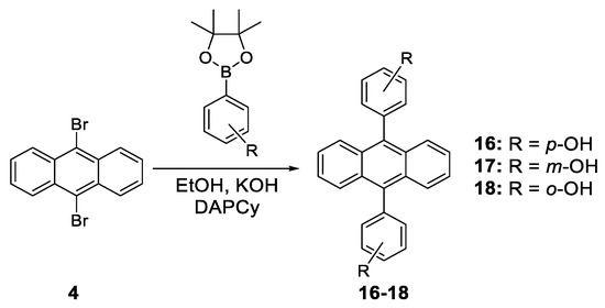 - Zelzer, M.; Kappaun, S.; Zojer, E.; Slugovc, C. Synthesis and Photo Physical Properties of 9,10-Bis(hydroxyphenyl)anthracene Derivatives. Monatsh. Chem. 2007, 138, 453–464. [Google Scholar] [CrossRef]