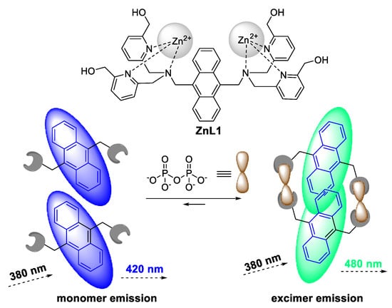 - Huang, F.; Feng, G. Highly selective and controllable pyrophosphate induced anthracene-excimer formation in water. RSC Adv. 2014, 4, 484–487. [Google Scholar] [CrossRef]