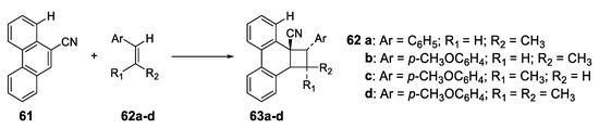 - Mizuno, K.; Pac, C.; Sakurai, H. Photochemical reactions of aromatic compounds. XIX. Photocycloaddition of olefins to 9-cyanophenanthrene. Singlet exciplex or triplet mechanism depending on olefins. J. Am. Chem. Soc. 1974, 96, 2993–2994. [Google Scholar] [CrossRef]