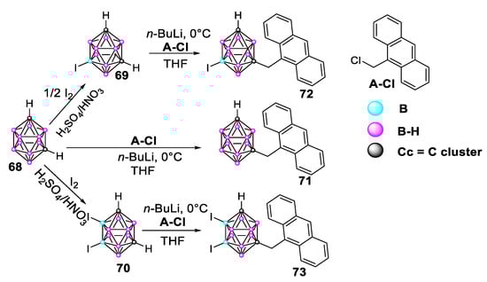 - Chaari, M.; Kelemen, Z.; Choquesillo-Lazarte, D.; Gaztelumendi, N.; Teixidor, F.; Viñas, C.; Nogués, C.; Núñez, R. Efficient blue light emitting materials based on m-carborane–anthracene dyads. Structure, photophysics and bioimaging studies. Biomater. Sci. 2019, 7, 5324–5337. [Google Scholar] [CrossRef] [PubMed]