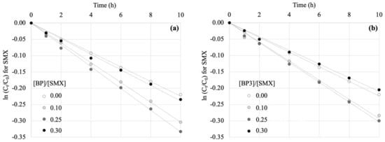 First order photodegradation kinetics for SMX in the absence and presence of (a) BP and (b) BP3 (for selected [BPs]/[SMX] ratios). Experimental conditions: [SMX]0 = 1.00 μM, pH = 7.0, temperature = 20 °C, degradation time = 10 h.