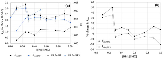 The relation between [BPs]/[SMX] and observed rate constant (kobs). (a) kobs for SMX (circles) and the inverse of total light screening coefficient () (triangles) at different molar ratios. The inverse of S corresponds to the light absorption. Error bars indicate a standard deviation of triplicated experiments. (b) Percentage change in kobs(BPs) for SMX compared to kobs(non BPs).