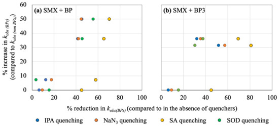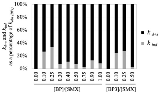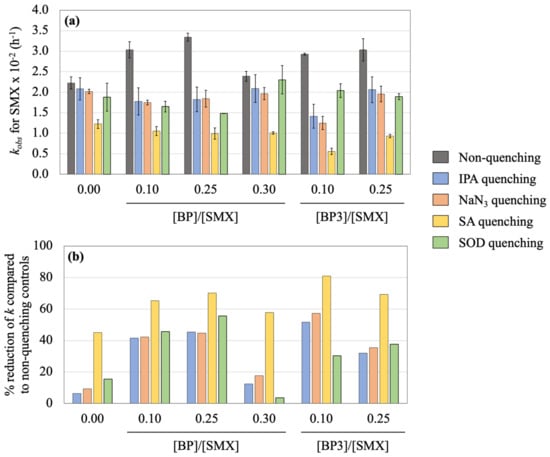 In case of the presence of BPs, 3SMX*, 3BP*, and 3BP3* quenching by SA caused the largest reduction of degradation rate of SMX for all tested BP and BP3 ratios (Figure 4b and Figure 5). Hence, triplet excited states are the most significant for the degradation of SMX in the presence of BPs. The addition of BP at ratios 0.10 and 0.25 significantly contributed to SMX degradation via •OH, 1O2 and O2•− radicals as shown in IPA, NaN3, and SOD quenching, respectively. Compared to their respective non-quenching controls, each of •OH, 1O2, and O2•− respectively contributed to 41.5%, 42.3%, and 45.6% of SMX degradation at the BP ratio of 0.10 and to 45.4%, 44.8%, and 55.7% at the BP ratio of 0.25. The largest reduction of kobs was observed at the BP ratio 0.25 for all quenchers. In fact, BP produces 3BP* upon irradiation, and then 3BP* can produce 1O2 by energy transfer to O2, abstract H from C-H bonds of alcohols, and produce •OH in the presence of H2O [12,57]. Therefore, the experiment of quenching 3SMX* and 3BP* reasonably displayed the highest inhibition of SMX degradation. Furthermore, the percentage reduction of kobs(BP) (Figure 4b) has increased when BP ratio increased from 0.00 to 0.25. Hence, the increase of kind from the BP ratio 0.10 to BP ratio 0.25 (Figure 3) is likely attributed mainly to the production of 3BP*.