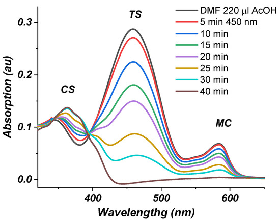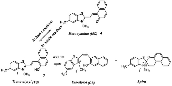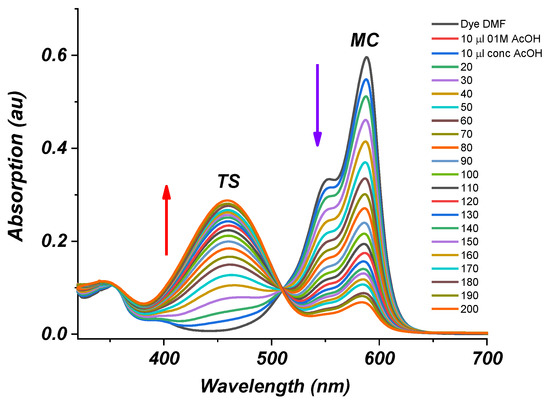 Solvents, such as DMF, DMSO, ethanol, and methanol, stabilizing the merocyanine form, are more suitable for investigating the E-Z photoisomerization of dye 3. The acidochromic properties of dye 3 in DMF were investigated. DMF–an aprotic, basic, polar solvent, can coordinate acidic protons with its lone pair. Dye 3 was titrated with glacial acetic acid in DMF. Figure 2 shows the change in the absorption of dye 3 as a function of the amount of glacial acetic acid added to a solution of the dye in DMF. As the amount of added acid increases, the intensity of the absorption band at 581 nm corresponding to the merocyanine form 4 (MC Scheme 2, Figure 2) decreases, while at the same time the intensity of the absorption band at 451 nm that corresponds to the trans-styryl (or so-called “protonated merocyanine”) form 3 (TS Scheme 2, Figure 2) increases. The merocyanine form converts into the protonated species, absorbing at λmax 480 nm upon the addition of acid to the solution. The presence of a distinct isosbestic point is unequivocal proof of the existence of the two discussed tautomeric forms (MC and TS) in DMF–acetic acid solution. The merocyanine form of dye 3 is stable in basic medium. The addition of glacial acetic acid (AcOH) leads to the formation of trans-styryl 3.