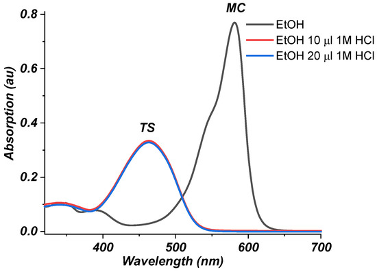 In ethanol, the merocyanine form 4 is stable, as can be seen from Figure 4 (black line). Then, 1 M aqueous hydrochloric acid was added to the solution, resulting in the formation of trans-styryl form 3 (463 nm, the blue and red lines in Figure 4). In contrast to the experiment in DMF, in ethanol, even small amounts of 1 M aq. HCl acid resulted in a complete conversion of form 4 (MC) to form 3 (TS). In ethanol–water, the TS form of the dye remains stable for at least 24 h, which is a prerequisite for performing the above experiment in the given new medium (ethanol/water). In an acidic environment, the merocyanine form is eliminated and is no longer the most stable form. Even if the spiro form is formed, under these conditions, it will quickly open to the cis (metastable) form, which is then stabilized in the trans form.