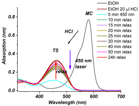 Irradiation with 450 nm laser light results in a reduction in the trans band (463 nm, brown line, Figure 5) and the formation of the cis isomer (321 nm, cyan line, Figure 5). In general, the molar absorptivity of the cis and trans forms does not commensurate. The cis form has very low molar absorptivity. After the irradiation, the solution is allowed to relax. The absorbance of the solution was measured every 5 min. As seen from the spectrum in Figure 5, after 24 h, the TS form is fully restored. The process of transition from merocyanine to the trans-styryl form will result in the production of energy when irradiated with light.