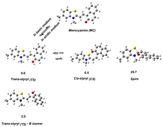 B3LYP/6-31G(d,p) optimized ground state structures (in water medium) and computed relative Gibbs free energies for the dye 3 isomers. Color scheme: gray—C, light gray—H, red—O, blue—N, yellow—S.