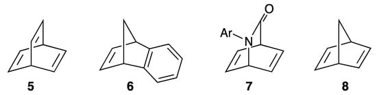 The formation of bicyclic compound 2 is especially interesting from the mechanistic point of view because it results from a di-π-methane rearrangement. Such reactions were discovered by Zimmerman, who summarized the first examples in a review exactly 50 years ago [5] and with a focus on synthetic applications later on [6,7]. In contrast to 1,4-cyclohexadiene (1), 1,4-bridged systems like barrelene (5) or benzonorbornadiene (6) have the advantage that they cannot undergo double-bond migration or aromatization. Very recently, Bach showed that 2-azabarrrelenones (7) are efficient precursors for the di-π-methane rearrangement as well (Figure 1) [8].