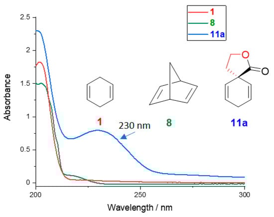 UV spectra of cyclohexadiene (1), norbornadiene (8) and spirolactone 11a.