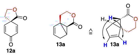 Next, we investigated reactions in a Rayonet reactor, fitted with 14 UV-C lamps. They are mainly emitting at 230–300 nm [19] and should be suitable to excite the absorption band at 230 nm (see Figure 2). However, after 6 h we observed only 10%, after 24 h, 44%, and after 5 d, 86% conversion (entries 6–8). The addition of copper(i) triflate, a suitable catalyst for [2 + 2] photodimerizations [9,12], did not accelerate the reaction (entry 9). We were able to isolate a new product 13a in a very low yield. An explanation might be that the long distance between the sample and the light source in a Rayonet reactor, resulting in long reaction times. Therefore, we constructed our own photochemical setup, placing a quartz tube with the substrate in close proximity (5 cm) to two UV-C lamps (Figure S4). Under such conditions, the conversion was much higher after 6 h (entry 10). Another problem was the solubility of products in MTBE because we observed the deposition of material at the glass surface. Thus, we switched to acetonitrile as the solvent and obtained 90% conversion after 12 h of irradiation (entry 11). Although we saw broad signals in the NMR of the crude product, which speaks again for higher molecular weight material, we detected, apart from starting material 11a, only one new product 13a. The compound was isolated using column chromatography in a 10% yield in an analytically pure form (entry 11, for analytical data, see Section 3, for NMR spectra, see the Supplementary Materials). The structure elucidation of the new compound 13a was not straightforward because it did not fit the expected products of [2 + 2] photodimerization or di-π-methane rearrangement. Thus, HRMS clearly showed a peak of [M + H]+: 151.0733, exactly like the starting material, and a dimerization can be excluded. On the other hand, a di-π-methane rearrangement would fit with the HRMS, but it would afford various regio- and stereoisomers (see calculations in Figure 4). Interestingly, in our photoreaction, only one isomer is formed. After careful examination of 2D NMR spectra, including HSQC, HMBC, and NOESY, we determined a tricyclic compound 13a as the most likely structure. Thus, no quaternary spiro carbon atom is detectable in the 13C NMR spectrum. The proton alpha to the lactone ring and its NOE to the two vinylic protons are distinctive (Figure 3 and Supplementary Materials).