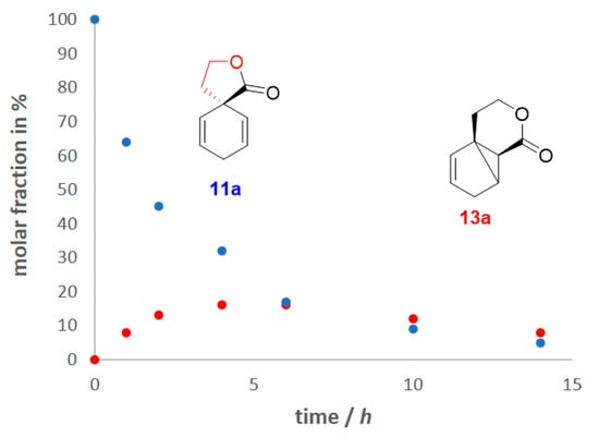 The main problem of the photochemistry of β-γ-unsaturated spirolactone 11a is the formation of higher molecular weight material, with distinctive broad signals in the NMR spectra and many peaks in the mass spectra of the crude product. This can be explained by radical intermediates depicted in Scheme 3, which can undergo hydrogen atom abstraction at the allylic position and further additions to the double bonds of the starting material or product. Therefore, we irradiated higher diluted solutions, and the yield was slightly increased already after 5 h (Table 1, entry 15 vs. entry 11). However, because of the small scale, the total amount of tricyclic compound 13a was very low. This problem might be resolved by continuous flow techniques in future work. To investigate the influence of the conversion on the yield, we conducted kinetic measurements with dimethyl suberate as the internal standard in deuterated acetonitrile (Figure 4, Section 3).