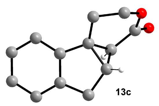 The lability of the starting materials and products leads to decomposition, and the yields are only moderate. But we were able to isolate all products using column chromatography or HPLC in pure forms (Section 3 and the Supplementary Materials). Furthermore, we obtained an X-ray structure of product 13c as a final proof that an oxa-di-π-methane rearrangement occurs (Figure 5). To summarize the photochemistry of β-γ-unsaturated spirolactones 11, they show an absorption band at 230 nm, which allows irradiations with UV-C light without additives. The reactions proceed presumably via the singlet excited state, affording only product 13 of an oxa-di-π-methane rearrangement. Although the yields are only moderate, because the compounds easily polymerize, we could synthesize interesting new lactones and elucidate the mechanism of their formation.