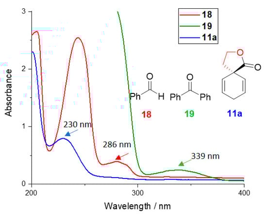 After the successful reactions of sole β-γ-unsaturated spirolactones 11, we became interested in their photochemistry in the presence of carbonyl compounds. Such functional groups can undergo a [2 + 2] cycloaddition to alkenes, affording oxetanes, known for many years as the Paternó–Büchi reaction [23,24,25]. Electron-rich double bonds like enol ethers give high yields, but the addition of benzaldehyde (18) to cyclohexene has been described as well [26,27]. Already these studies showed that, apart from oxetane formation, hydrogen atom abstraction from the allylic position can compete. This pathway was predominant when 1,4-cyclohexadiene (1) was used as a precursor with benzophenone (19) as the carbonyl compound [28]. UV spectra of benzaldehyde (18) and benzophenone (19) indicated that their n-π*absorption bands can be excited with UV-B light, whereas spirolactone 11a does not react (Figure 6).