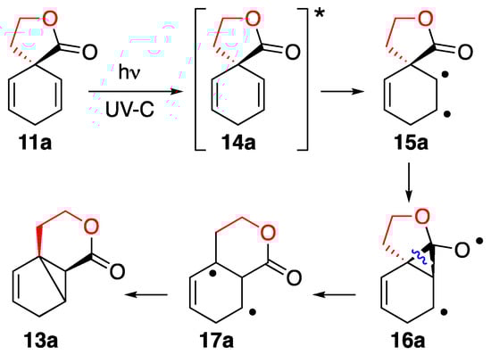 After irradiation with UV-C light, an excited state 14a is formed and diradical 15a can attack the adjacent carbonyl group. Intermediate, 16a should be short-lived and can react back or open to diradical 17a, which finally affords the tricyclic compound 13a. Interestingly, in contrast to di-π-methane rearrangements [7], almost all reactions of the oxa analogs have been discussed in the literature to proceed via their triplet states and, thus, sensitization was advantageous [5,20]. Therefore, we irradiated a solution of β-γ-unsaturated spirolactone 11a in acetone with UV-C light for 12 h. However, we observed only a low conversion and no tricyclic compound 13a could be detected in the NMR of the crude reaction mixture (Table 1, entry 12). The addition of xanthone, a suitable sensitizer for di-π-methane rearrangements [8], and irradiation at longer wavelengths gave no conversion either (entry 13). Finally, the addition of the known triplet quencher isoprene [22] did not inhibit the reaction (entry 14). All these results speak for a reaction from the excited singlet state, which was indeed postulated for the oxa-di-π-methane rearrangement of an ester [21].