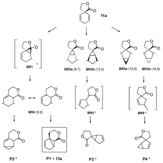 Proposed mechanism for the formation of tricyclic compound 13a from spirolactone (11a). * Represents the excited state.
