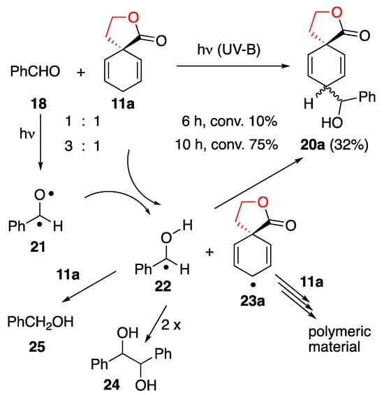 Thus, we started our investigations with β-γ-unsaturated spirolactone 11a and benzaldehyde (18). A 1:1 mixture was dissolved in acetonitrile in the presence of dimethyl suberate as a internal standard and irradiated with two UV-B lamps (Section 3). However, after 6 h, we observed only a 10% conversion and, therefore, we increased the time and equivalents of benzaldehyde (18). Indeed, now we obtained a 75% conversion and the allylic coupling product 20a in a 32% yield (Scheme 6).