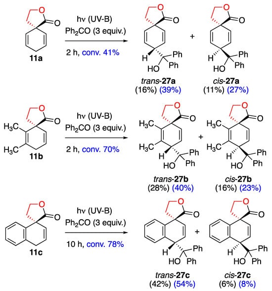 Photoreaction of β-γ-unsaturated spirolactones 11 with benzophenone (19). Yields in blue are related to the conversion.