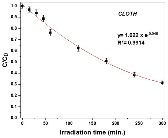 Firstly, a preliminary photodegradation experiment of clothianidin in bi-distilled aqueous solutions (C0 = 10 mg L−1) (without the presence of hydrochar) was carried out in order to compare the effect, either positive or negative, of hydrochar particles and dissolved organic matter (DOM). Dark adsorption of clothianidin in hydrochar particles was <7.5% for the higher concentration of hydrochar particles (400 mg L−1). The photolytic degradation kinetics of clothianidin in bi-distilled water followed first-order kinetics, as shown in Figure 2. The half-life (t1/2) calculated using the equation t1/2= ln2/k was 173.3 min (Table 1).