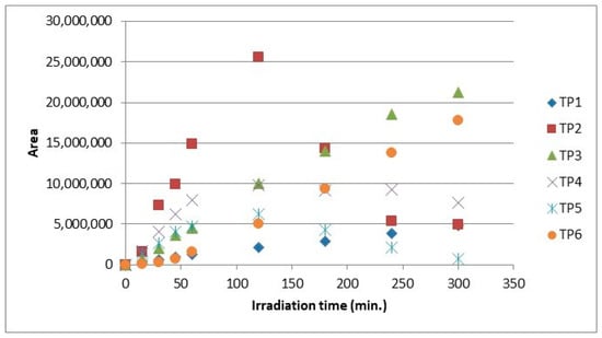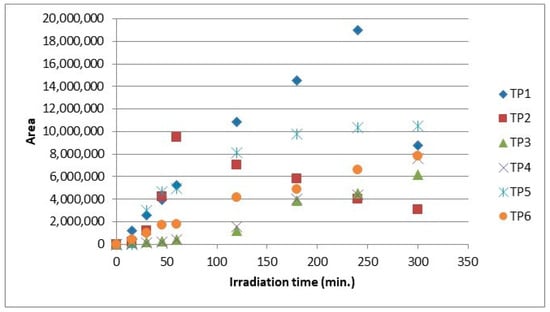 The evolution profiles of the transformation products during the photolytic process of clothianidin in hydrochar suspensions and in bi-distilled water are provided in Figure 5 and Figure 6, respectively. According to the maximum intensities of the mass spectra, with the presence of hydrochar particles (HCp), the formation of TPs followed the trend TP2 > TP3 > TP6 > TP4 > TP5 > TP1. The maximum concentrations of TP2, TP4 and TP5 were determined after 120 min of the photolytic process, while for TP1, TP3 and TP6 after 300 min, respectively (Figure 6).