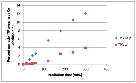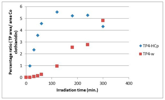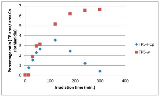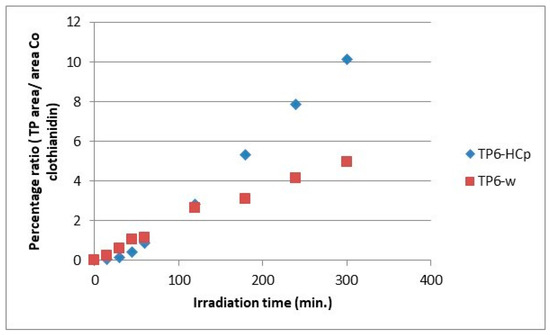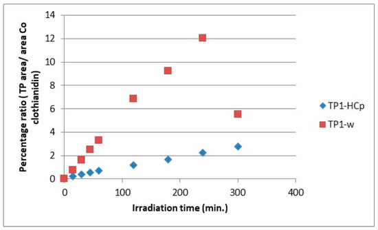 In the case of the photolytic process of clothianidin with the presence of aqueous extracts (HCw), the formation of TPs followed the trend TP1 > TP5 > TP2 > TP6 > TP4 > TP3. The maximum concentrations of TP1 and TP5 were determined after 240 min of the photolytic process, while for TP3, TP4 and TP6 after 300 min and for TP2 after 60 min, respectively (Figure 5).