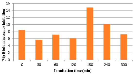 The ecotoxicological impact of the photolytic processes in relation to the formation of TPs was investigated by evaluating the ecotoxicity changes throughout the irradiation treatment. Toxicity assessment was performed using the Microtox bioassay and the results are summarized in Figure 14. The percentage of inhibition in the initial solution is 8.5% while after the photolytic process, it is 7.2%, showing a slight decrease. The greatest inhibition of bioluminescence and therefore the greatest toxicity was observed at 180 and 240 min of irradiation and corresponded to 14.8% and 10.1% bioluminescence inhibition. These findings are in agreement with the findings of evolutionary profiles of the transformation products showing peak concentrations of most TPs around 180 and 240 min after the beginning of the photolytic processes.