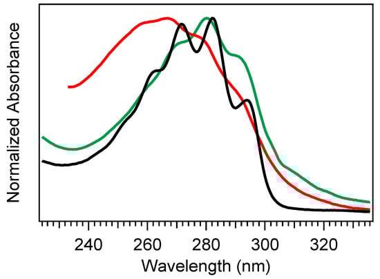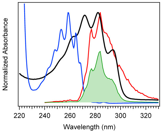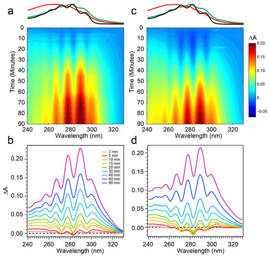 Figure 6a,b, it fades into a large growth spanning the entire 240–320 nm region, the center of which reveals vivid vibronic signatures with characteristic peaks at 300 nm, 290 nm, and 278 nm. These features are very close to the first three vibronic bands of the Tachy spectrum, and the nearly 2× increase in ∆