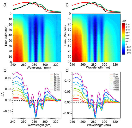 λmax) of the same pair of starting solutions. The effect of Phe on the Pro-D spectral evolution and its wavelength dependence are evaluated through the time-resolved difference absorption spectra, which conveniently subtract Phe’s contribution to the total absorption spectrum. Its complete absence in the ∆